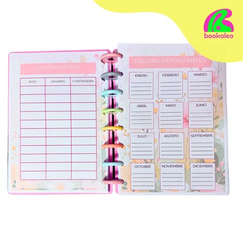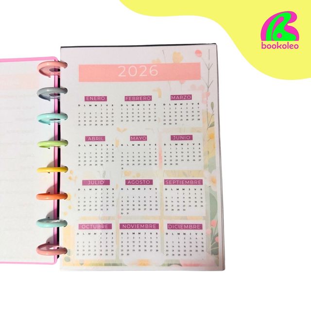 Agenda 2026 impresa con sistema de discos. Incluye una página por día, calendarios mensuales, sección de contraseñas, fechas importantes y diseño floral en todo el año. Ideal para organizarte fácil, cómodo y con estilo. Ver más detalles