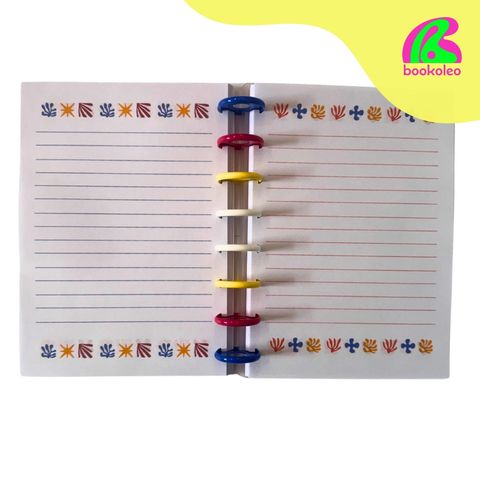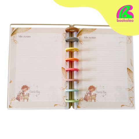 Son 120 hojas ilustradas, con detalles gráficos suaves en los bordes (no invaden el espacio de escritura), papel grueso de 90 g y perforación para discos inteligentes. Las podés poner, sacar y reorganizar todas las veces que quieras sin que se rompan.